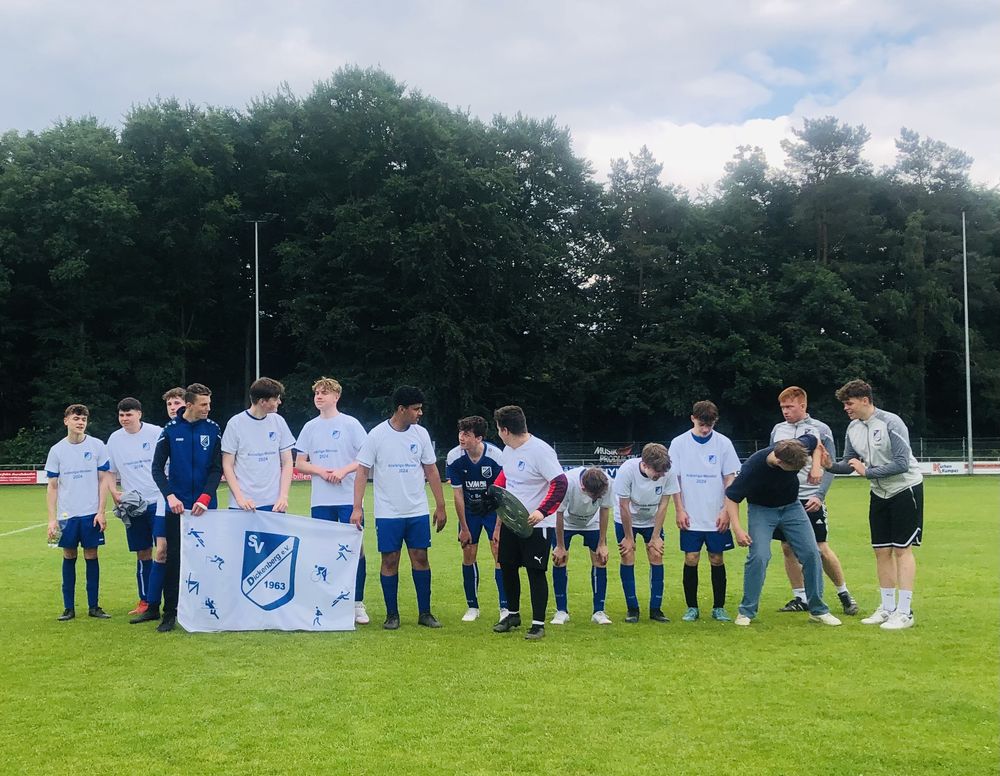 Am 08.06.24 sicherte sich die B-Jugendmannschaft des SV Dickenberg am vorletzten Spieltag der Saison im Spiel gegen TuS Recke mit einem 4:4 die Meisterschaft! Im Zuge des Jugend- Sommerfestes ließ sich die Mannschaft zusammen mit ihrem Trainerteam Paul Kruse, Jan Veit und Jannes Schnieders gebührend von den Zuschauern feiern. Am letzten Spieltag gab es dann gegen den Tabellenletzten JSG Hörstel/Dreierwald II einen ungefährdeten 6:3 Auswärtssieg. Somit konnte die Dickenberger B-Jugend die Saison mit 11 Siegen, 2 Unentschieden und nur einer Niederlage erfolgreich beenden.