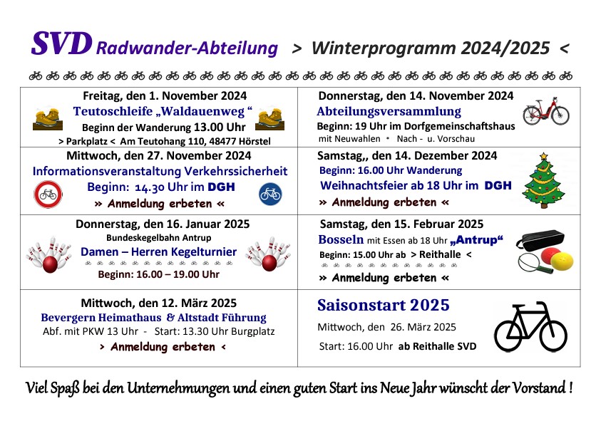 Die Radwander-Abteilung des SVD gibt es in der jetzigen Form seit Anfang 2000. Von April bis Oktober finden alle 14 Tage -  jeweils am Mittwoch ab 15:30 Uhr und im Oktober ab 15.00 Uhr  -  Radtouren von ca. 35 Km mit Getränkepause statt.  Es werden außerdem Touren mit PKW/Radträger und Tagestouren angeboten. Die Touren werden vorher von  einzelnen Mitgliedern  der Radabteilung abgefahren, organisiert und betreut. Für die Verkehrssicherheit wird bestens gesorgt und ein Fahrradhelm sollte für  alle Teilnehmer selbstverständlich sein! Die Beteiligung liegt im Durchschnitt bei 15 bis 25 Teilnehmern. Im Winter wird ein ansprechendes Programm mit Abteilungsversammlung, Wandern, Weihnachtsfeier, Kegelturnier, Bosseln und Besichtigungen  angeboten.