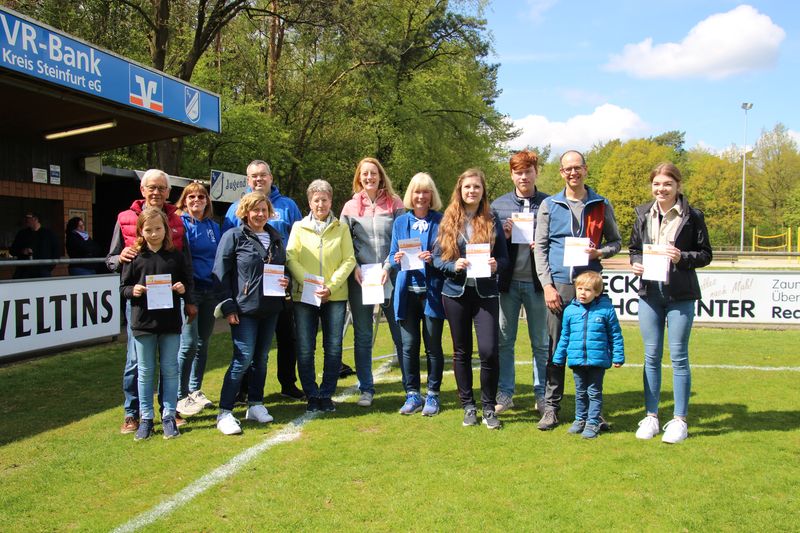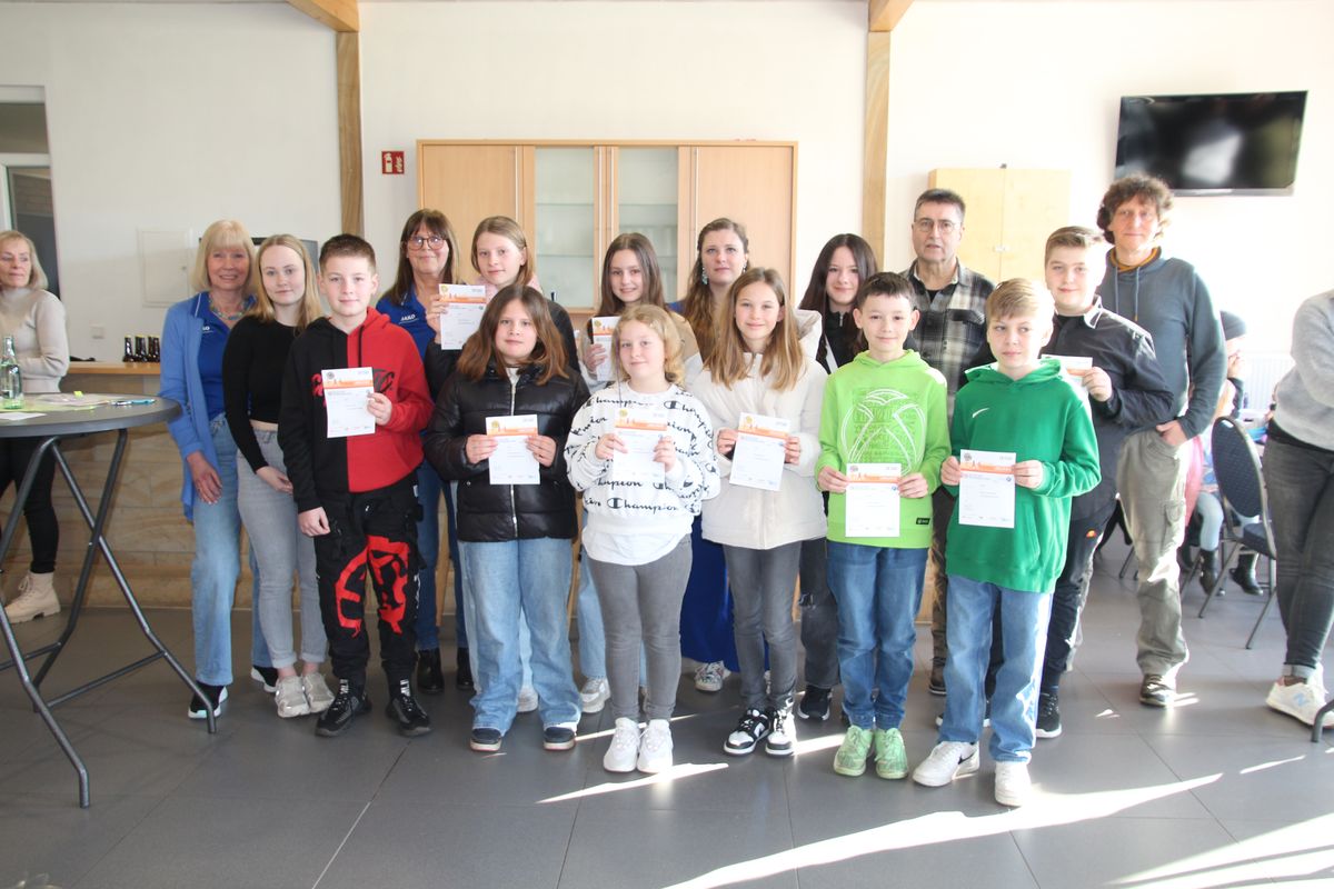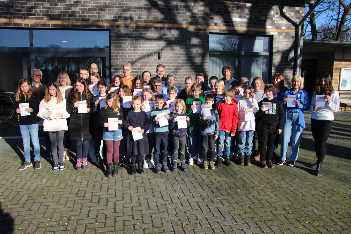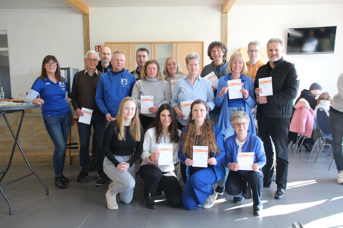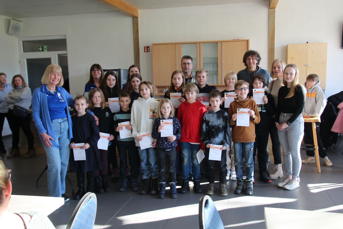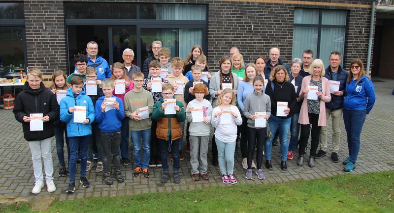 Am Sonntag den 28. Januar fand die feierliche Übergabe der in 2023 erworbenen Sportabzeichen statt. 48 Sportler waren in 2023 erfolgreich und erwarben das Sportabzeichen in Bronze, Silber oder Gold. Damit konnte die Teilnehmerzahl gegenüber 2022 deutlich gesteigert werden. Die meisten der 48 erfolgreichen Absolventen fanden sich zur feierlichen Übergabe am 28. Januar im Sportheim ein. Über die sehr gute Beiteiligung an den Prüfungen im August und September, sowie bei der Übergabe im Sportheim freuten sich die Prüfer Angelika Nigbur, Ingrid Lange, Sophia Schwieterjann, Leonie Nigbur, Thomas Kerk und Martin Gerhards. Nach der Übergabe folgte noch ein kleiner Imbiss mit Erfrischung für die erfolgreichen Sportlerinnen und Sportler.